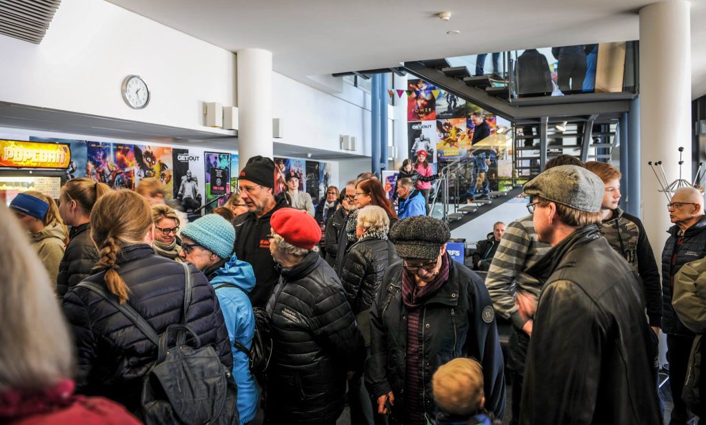 Kattava valikoima elokuvaherkkuja myynnissä. Odotusaulassa paljon istumatilaa. Salin penkit on uusittu elokuvasäätiön tuella 2018.